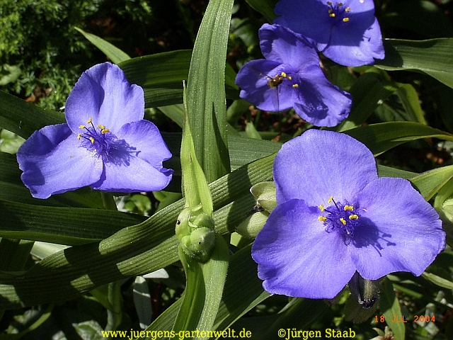 Beschreibung: Dreimasterblumen , auch Gottesaugen genannt, sind eine Gattung in der Familie der Commelinagewächse innerhalb der Einkeimblättrigen Pflanzen. Es gibt etwa 70 Tradescantia-Arten. Ihr Ursprung ist Süd und Nordamerika. Es gibt Arten,die nur im Zimmer gehalten werden und welche für den Freilandbereich.